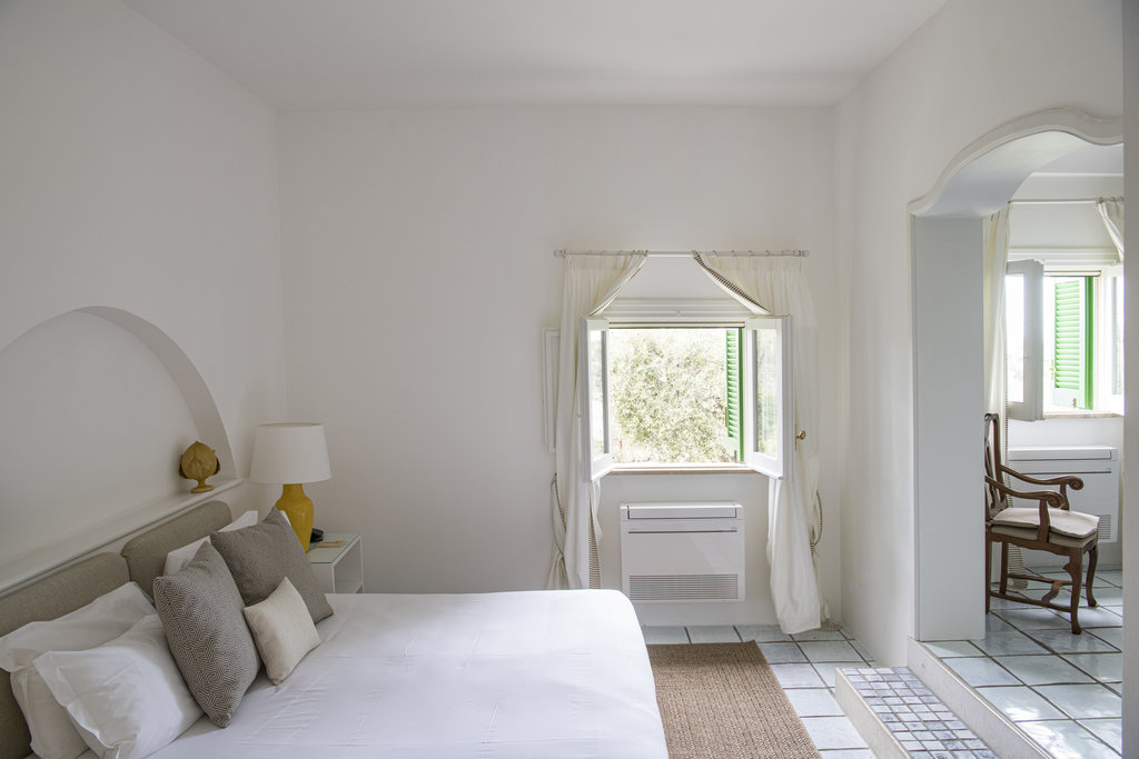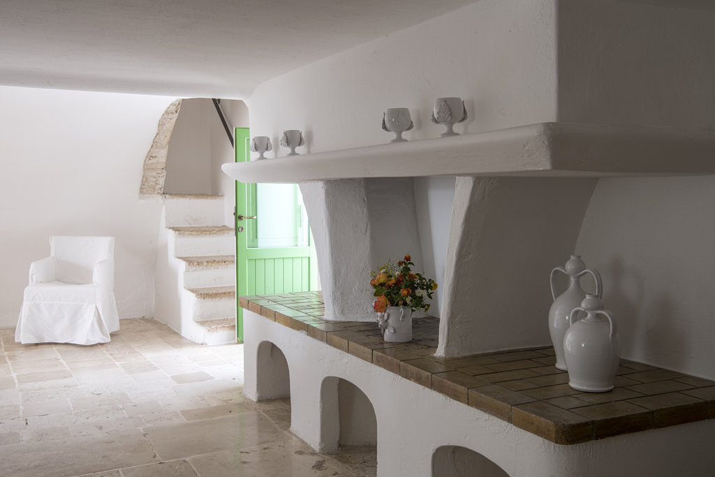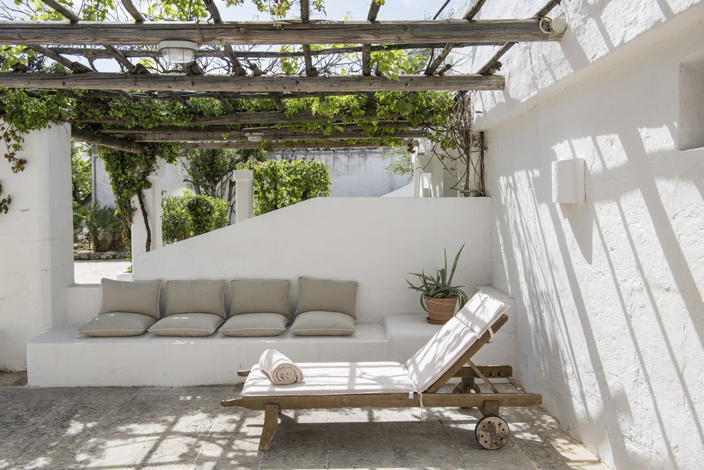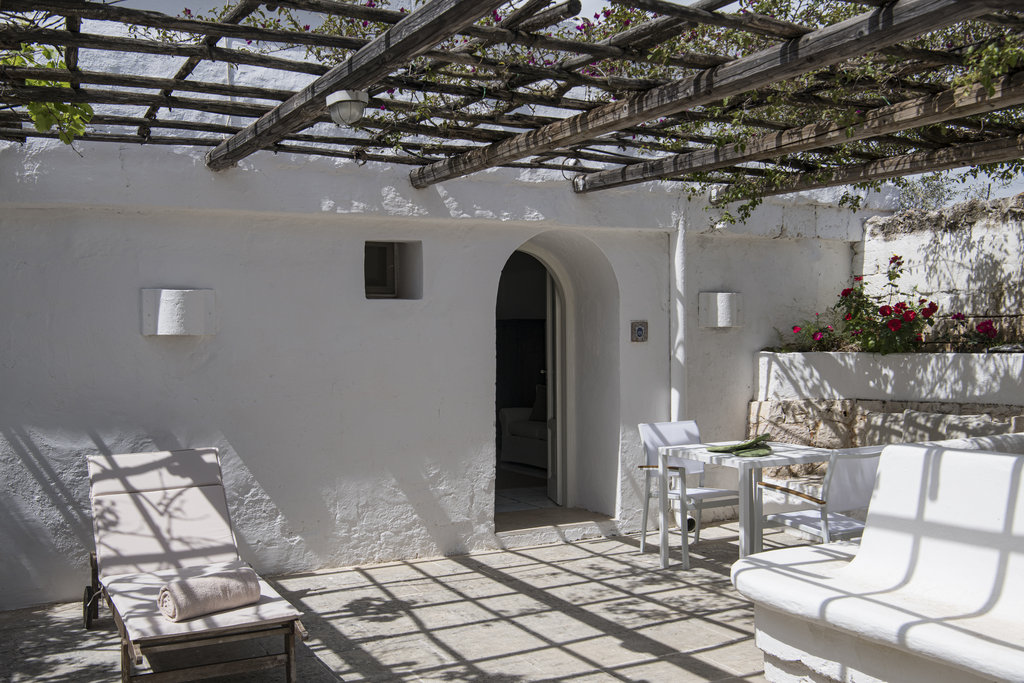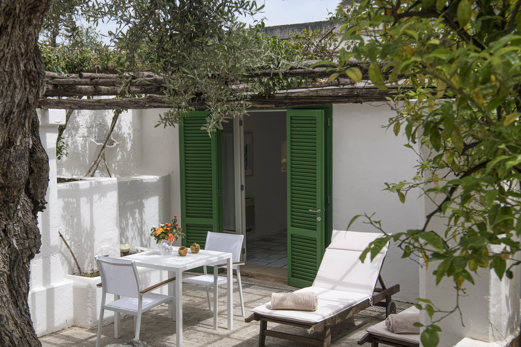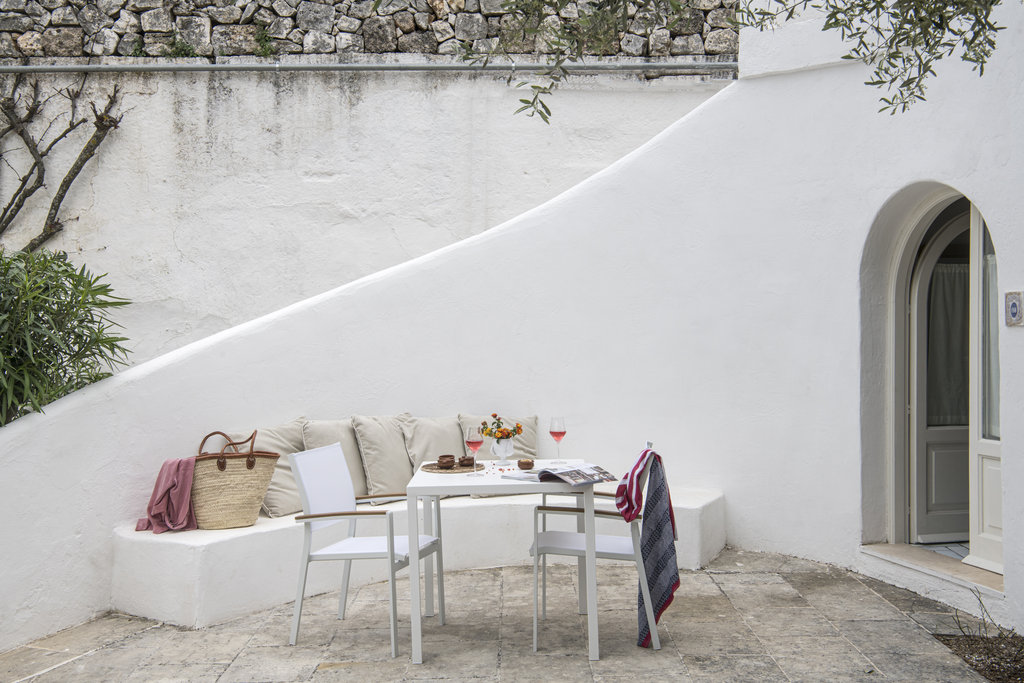 酒店设有室外泳池和宁静的水疗中心,散发着现代意大利度假胜地的气息。但是,盘旋的墙壁却昭示着它过去曾是一座坚固的农舍,用于保护普利西亚丰富的物产免于被萨拉森人侵袭。如今,它敞开大门,桌上摆放着主厨使用多种酒店自种食材烹制而成的当地美食,静待游客的到来。这种过去与现在的融合也体现在了客房之中,白色的墙壁变成古董家具和原创艺术品的时尚画布。